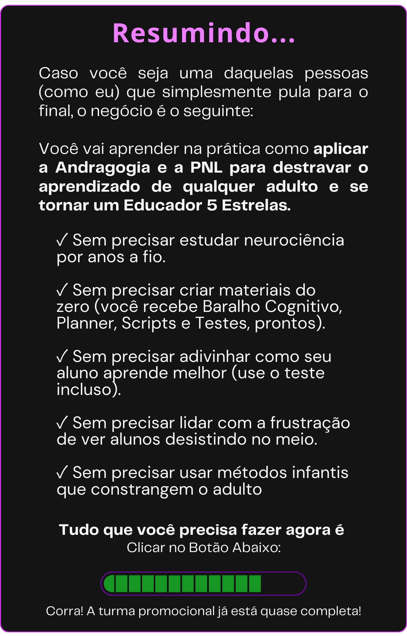 O problema é que a maioria dos cursos te ensinou a dar aula, mas não te ensinou a lidar com a mente de quem aprende. Insistir em métodos tradicionais (aulas 100% expositivas) com adultos é como tentar abrir uma porta usando a chave errada: só gera resistência e frustração para os dois lados.